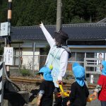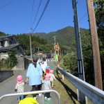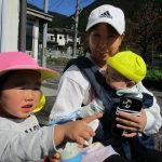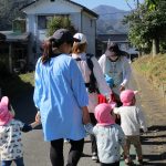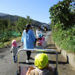 先生と手をつないで歩き、0歳児さんはお散歩カーに