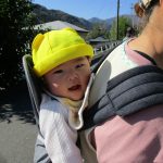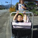 乗って、月齢の小さい赤ちゃんはおんぶで