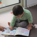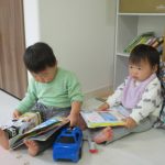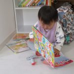 車を走らせてみたり、絵本を真剣に観ている