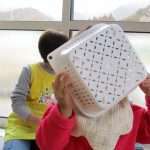 カゴがお気に入りでお顔を隠し、いないいないばぁ~を