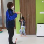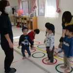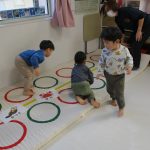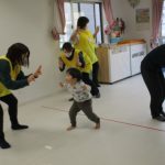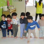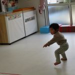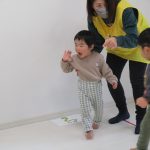 月齢の大きいお友達は先生と手をつないで歩き、
