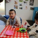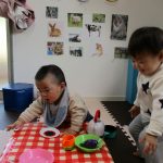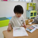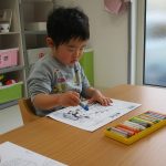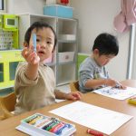 1歳児さんはクレヨンを使って、2歳児さんは