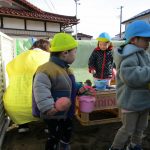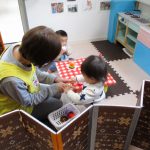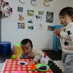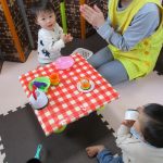 お店屋さんは2歳児さん、お客さんは1歳児さんと