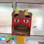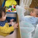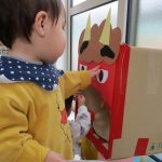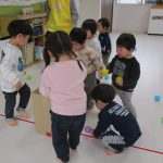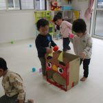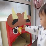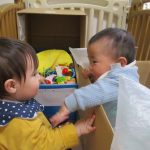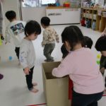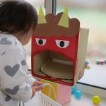 0歳児さんはダンボールで作ったお風呂や鬼で遊び