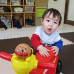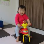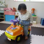 0歳児さんは少し早めにお部屋に戻り、乗用玩具で