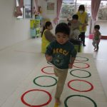 先にあるフラフープの輪っかをジャンプで進みました!!