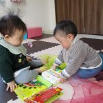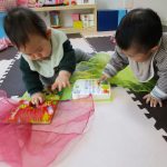 0歳児さんの小さいお友だちは室内で遊びました。