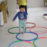 ジャンプの後は並んだフラフープに合わせて