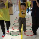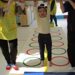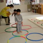 ジャンプの後は並んだフラフープに合わせて