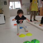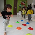 並んだカラーコーンを踏まないように通ったり