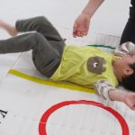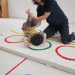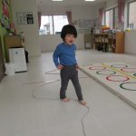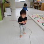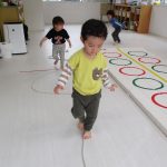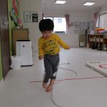 床に置いてある縄跳びのくねくね道を歩き、