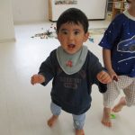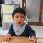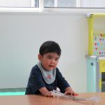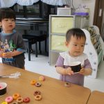 1歳児さん・・・偶然ドーナツの穴にトングが