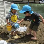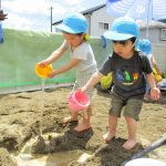 砂場に穴を掘ると、2歳児さんはバケツで水を何度も