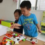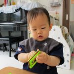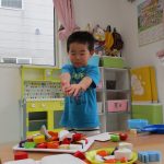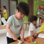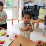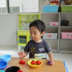 2歳児さんは上手にまな板と包丁を使って食材を切り、