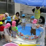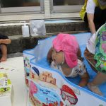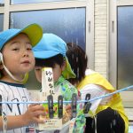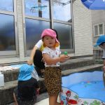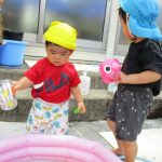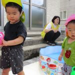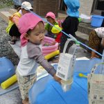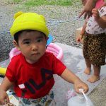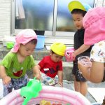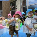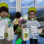 コップで水を汲み牛乳パックに入れて水が出てくる