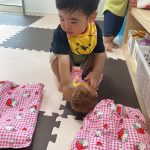 メルちゃんを抱っこしたりお布団に寝かせたり
