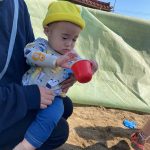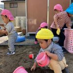 カップやバケツに砂を入れたりする0・1歳児さん、