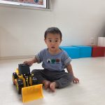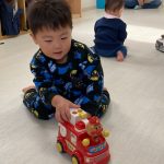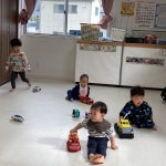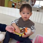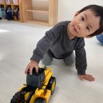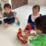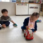 0歳児さんは大きいお友達から車を貸してもらい