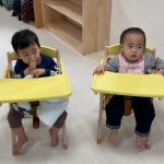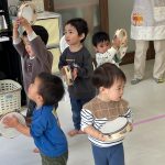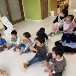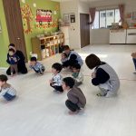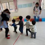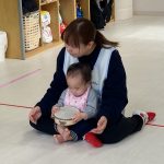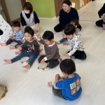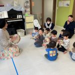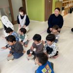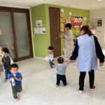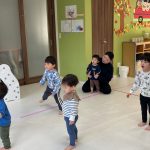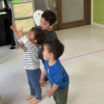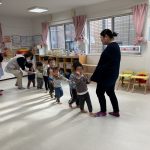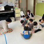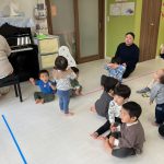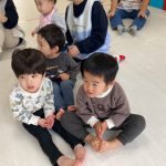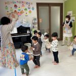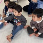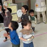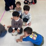 お歌に合わせながら、タンバリンを頭、肩、膝に