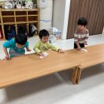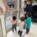 テーブルも裏側まで拭いたり、窓ガラスや先生の真似っこを
