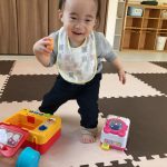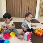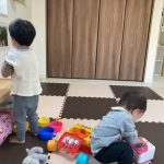 お互い好きな玩具を持ってきて動かしたり、重ねたりして遊んでいました。