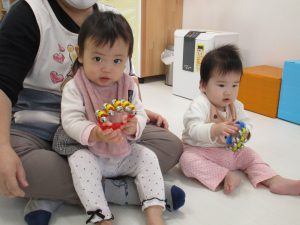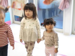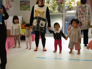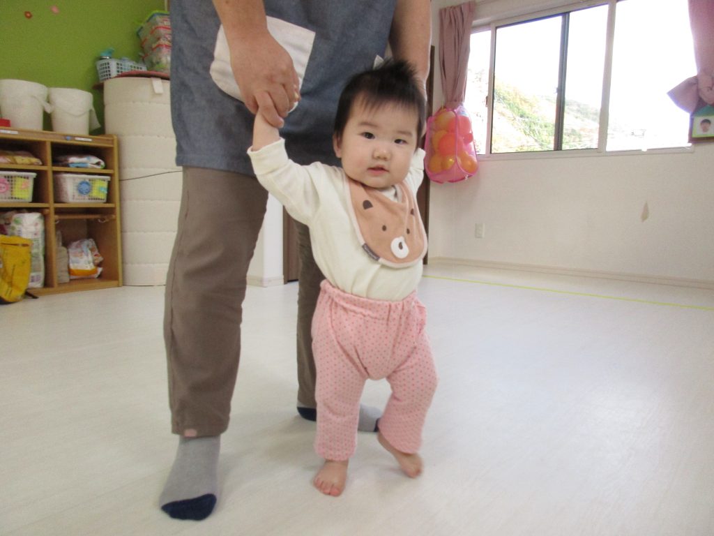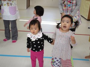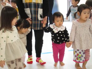0歳児クラスのお友達と手を繋いで