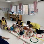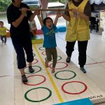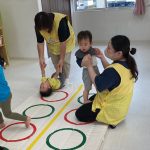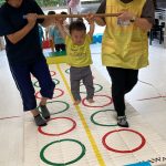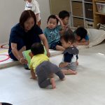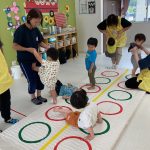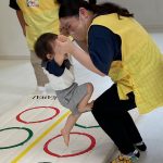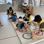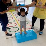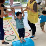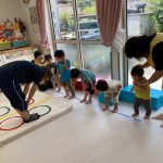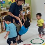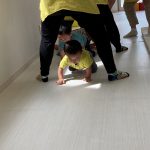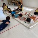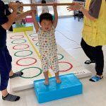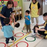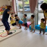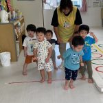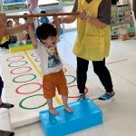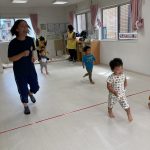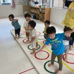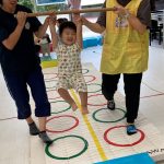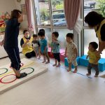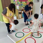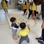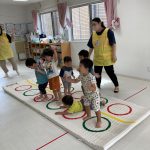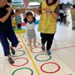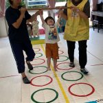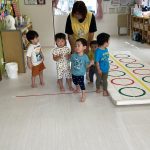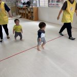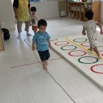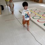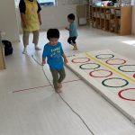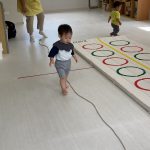 なわとびの上を歩くのは2歳児さんはスタスタ進んで