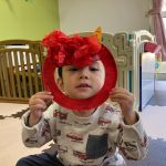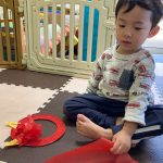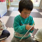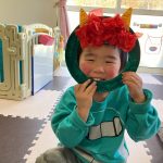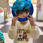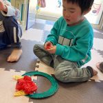 2歳児さんは鬼のお面製作の続きで髪の毛をつけました。