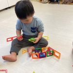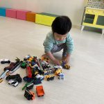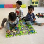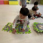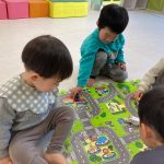 大きいお部屋で道路のマットで車遊び、マグネットのブロック、井形ブロックの中から