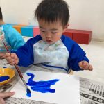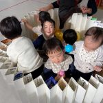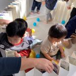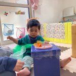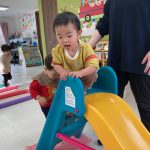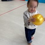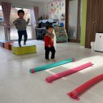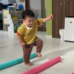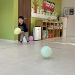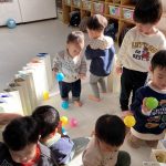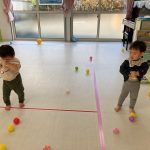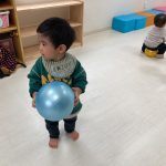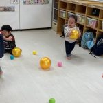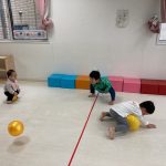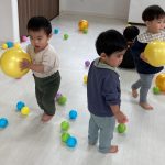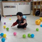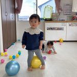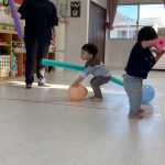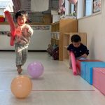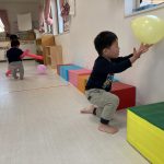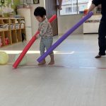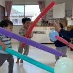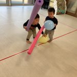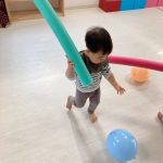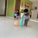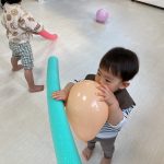 1・2歳児さんは風船とプールスティックを使って