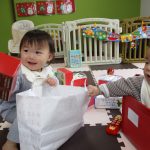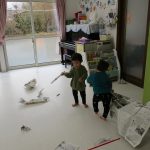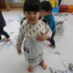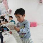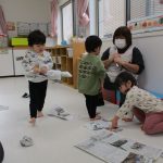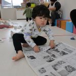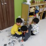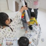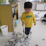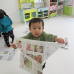 1・2歳児さんは新聞紙遊び、0歳児さんは玩具