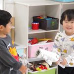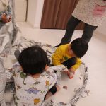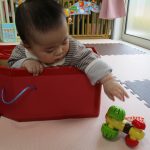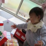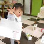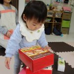 月齢の大きいお友達は箱で作った手作り積木を