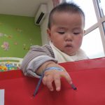 側に置いてある玩具を見つけて、取ろうと手を
